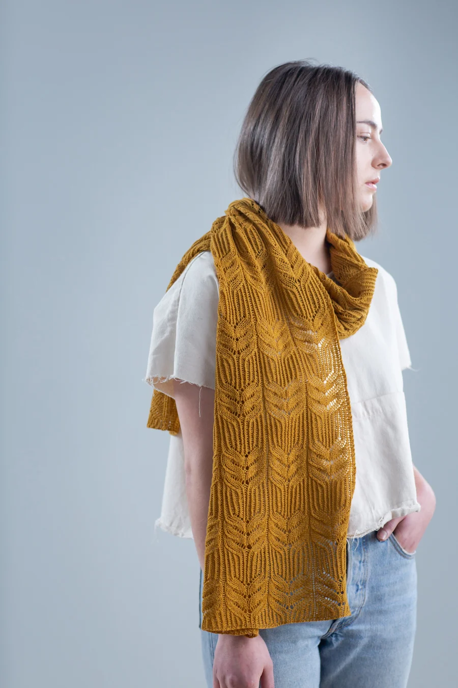 The Ensata Scarf has been designed for either laceweight or fingering-weight yarn, and is shown here in Brooklyn Tweed Vale in the colourway Klimt. You will need 3 skeins of Vale or 6 skeins of Peerie to knit the scarf. The cowl and hat are both designed for fingering-weight yarn, and are shown in Brooklyn Tweed Peerie in Patina and Fleet (respectively). You will need 2 skeins for the cowl and 1 for the hat.
