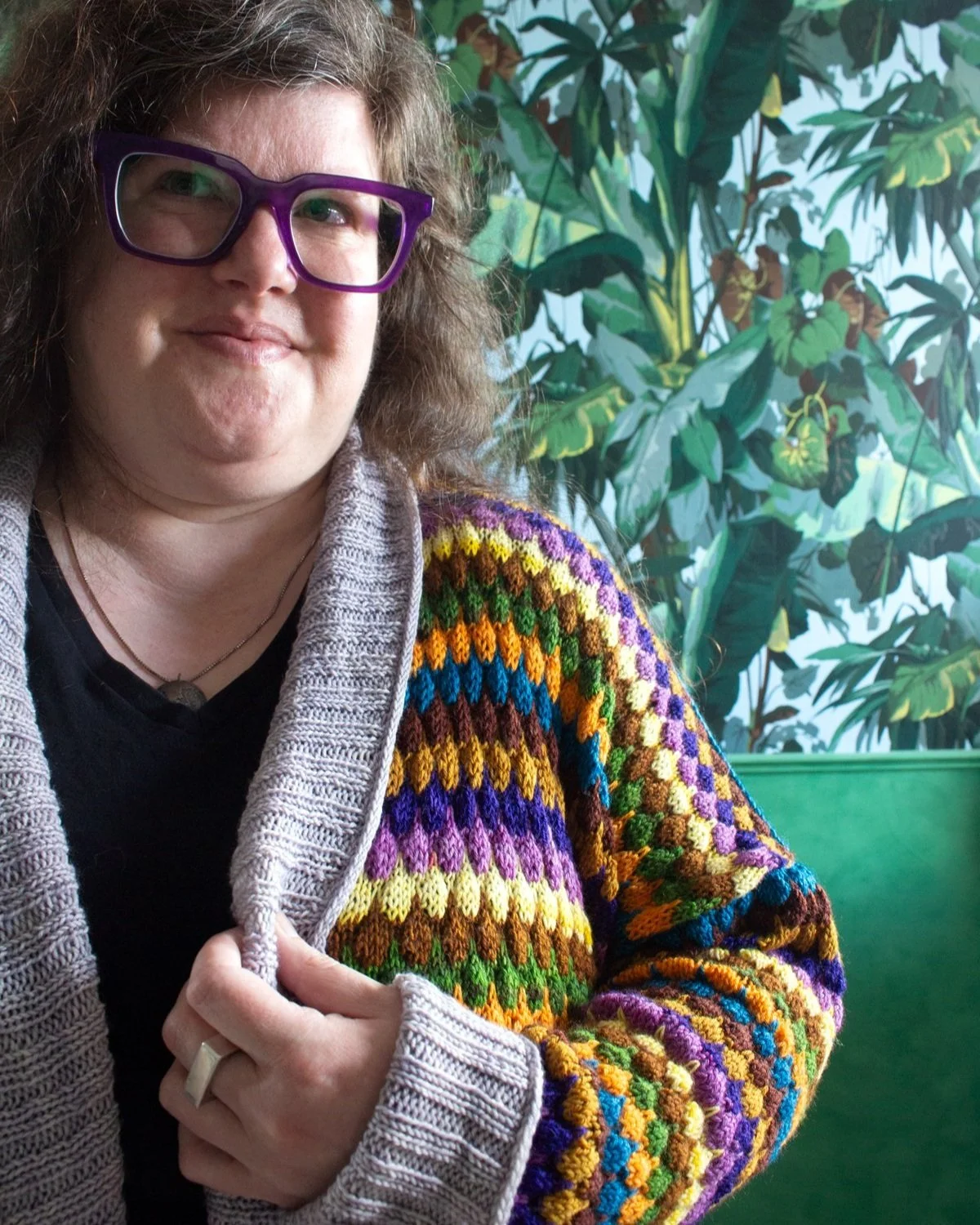 My Bubble Cardigan (finished in August 2024) is big, comfy, colourful, and exactly what I wanted. I like the mid-thigh length, and the sleeves fit nicely with the cuffs turned back, which I prefer. Three years of chipping away at the stripes and I ended up with a garment I enjoy wearing. :)