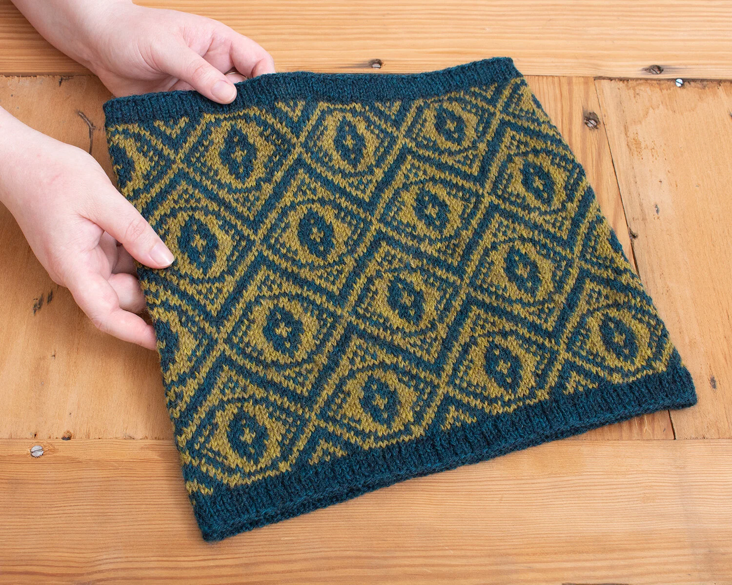 I blocked this Beeswax Hat over a balloon to show off the pretty crown decreases. The Beeswax Cowl in the background is the new taller size.